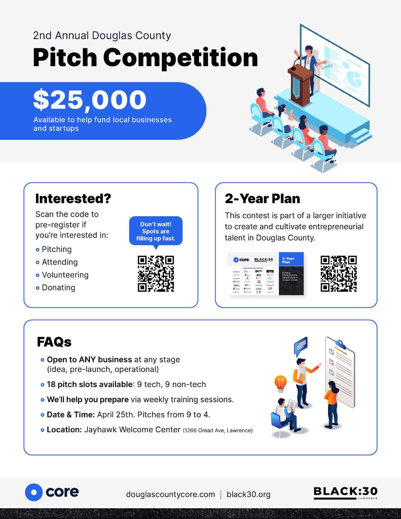Douglas County CORE, in partnership with Black:30, is hosting its second annual pitch competition. Set for April 25, the competition has 18 pitch spots – nine for tech startups and nine for non-tech startups. There’s $25,000 in prize money at stake, including $4,000 for the first-place winner in each track (tech and non-tech). This competition is open to all aspiring entrepreneurs or those whose businesses are either new, growing or seeking to make significant changes to their existing business models.